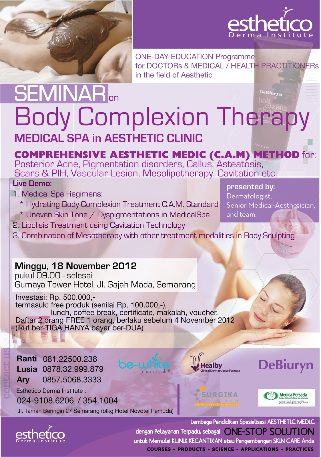 Lembaga Pendidikan Resmi dengan Spesialisasi AESTHETIC MEDIC bagi para DOKTER dan PROFESIONAL yang INGIN BUKA Klinik Kecantikan Dengan Konsep COMPREHENSIVE AESTHETIC MEDIC (C.A.M) yang Unik dan Multi-Disciplinary Terakreditasi Internasional sebagai CIBTAC CENTRE Ph: +62.24.9108.6206 - Pin BB: 23885492